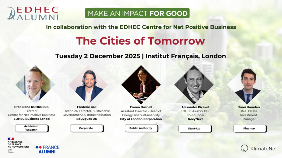 The EDHEC Centre for Net Positive Business’s Director, Prof. René Rohrbeck, will open the evening with a keynote on why new business models are key to fast-tracking our transition toward regenerative cities.